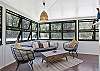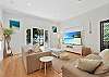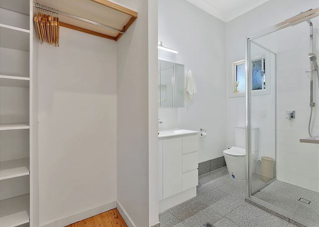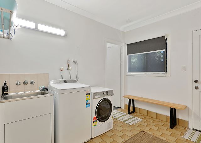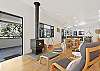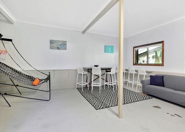 The expansive air-conditioned open plan living, dining and kitchen area is a beautiful space for family and friends to come together, with all areas having access to the deck. The lounge area offers views to the ocean and has an 80-inch smart TV with a Netflix account free for guests to use. Relax in the chairs positioned in front of the firebox for those chilly nights or gather the family and friends around the outside fire pit (BYO Wood). The large dining table seats 10 and the spacious kitchen offers a 90cm electric freestanding oven, large family fridge, dishwasher and pod coffee machine with stool seating at the breakfast bar for four. The Eastern end of the deck offers an enclosed seating area and access to the downstairs area which offers a games room with a ping pong table and more lounging options. The fifth bedroom is accessed through the laundry and offers two single beds. Please note there is no bathroom on this level.