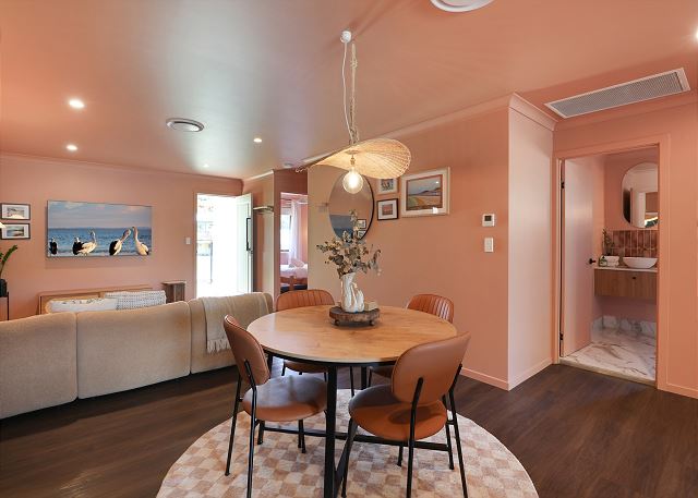 The light-filled open-plan living and dining area is the ideal spot to come together after a day at the beach. Stay cool and comfortable with ducted air-conditioning throughout, and enjoy entertainment and connection with complimentary Wi-Fi and a flat-screen TV.