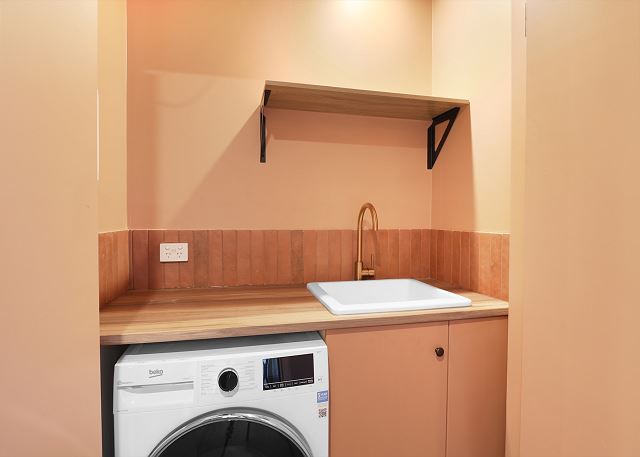 A laundry with a washing machine and ironing board ensures you have everything you need.